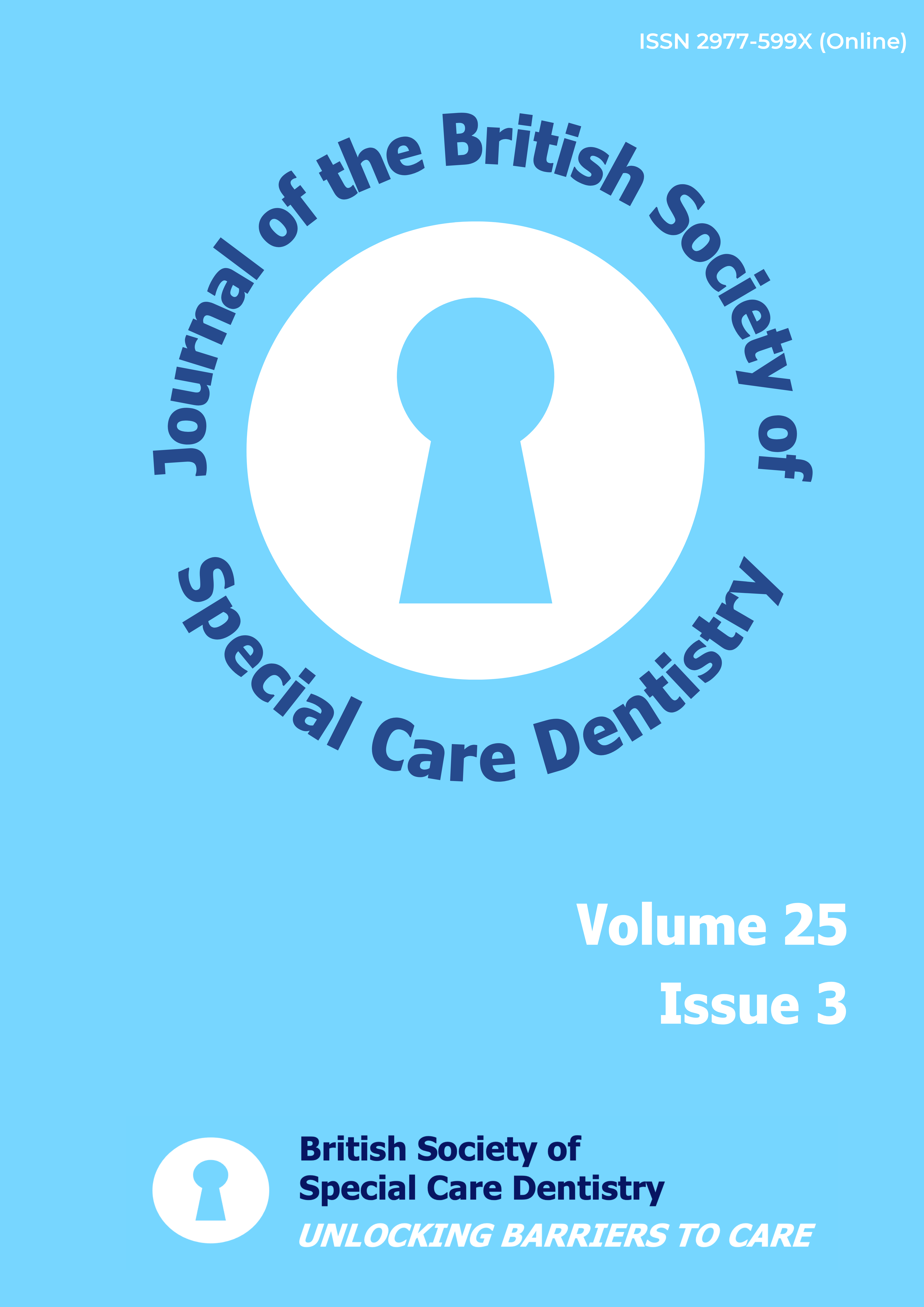 N.B. From 2025 the numbering format of the Journal for the British Society of Special Care Dentistry changed. The new format uses the year of publication followed by the issue number. The first issue of the Journal of the British Society of Special Care Dentistry is volume 2025, number 1 published in April 2025.